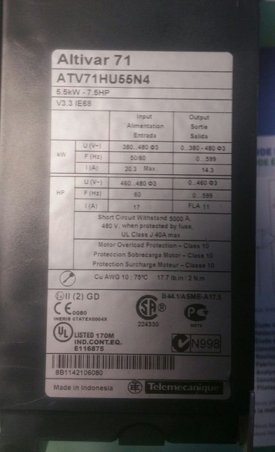 Variateur de fréquence Schneider Altivar 71 ATV71HU55N4 5.5kW – 7.5 HP V3.3 IE68